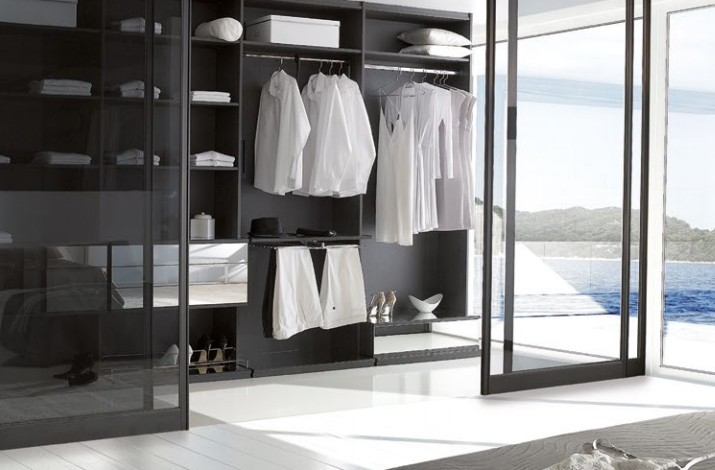 Dressing ouvert en bois noir, au design moderne et masculin, sublimé par l’association élégante du verre et du métal pour un espace de rangement à la fois sophistiqué et contemporain.
